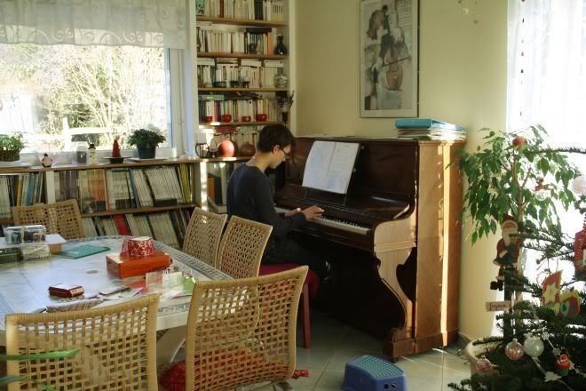 We were up so late, but we got a sleep in. Margaux and i woke at 8 because she wasn't supposed to start until 9. Turns out her french teacher was away, we could have slept in until 11. Lucas picked us up at 9 as usual. he had class at ten, i stayed with margaux until 12. Lucas, hudson (fellow australian), vincent & I went to english. Lucas & I went home &t 1. He plays piano well, and he's never had lessons. I tried, and failed, so took photos of his backyard.